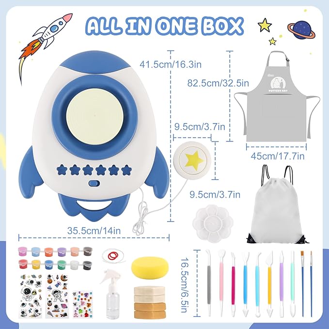 • Complete Pottery Wheel for Kids Kit: This pottery wheel set comes with 4 packs of air-dry clay, 12 vibrant paints, 2 brushes, sculpting tools, a sponge, a palette, an apron, a storage bag,a cutting wire, and fun stickers. A one-stop shop to meet your kids creative needs from shaping to coloring and to stimulate artistic potential. Create your own original piece of artwork.