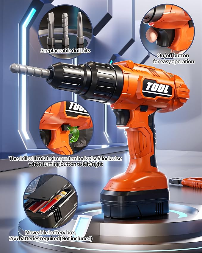• 【2 in 1 Electric Drill & Electric Saw】With 2 replacement heads, the electric drill can be turned into an electric saw. Only 2 AA batteries are needed to simulate sounds and actions, allowing children to repair their own toys like dad.