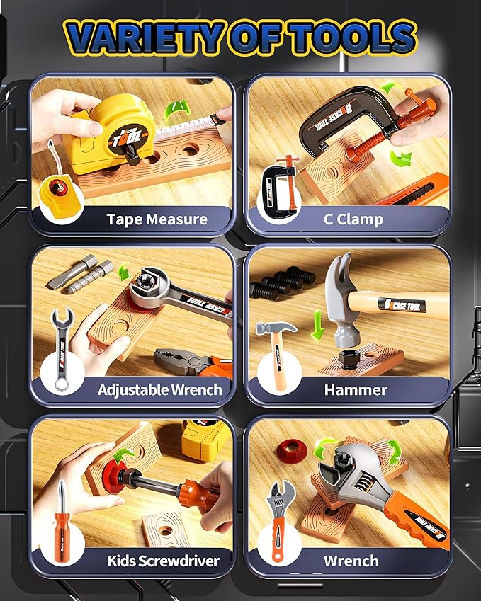 • 【Durable and safe material】Made of high-quality ABS material, safe and environmentally friendly, harmless to the human body. Meets US toy ASTM. All tools are designed for children, with rounded edges and smooth surfaces.