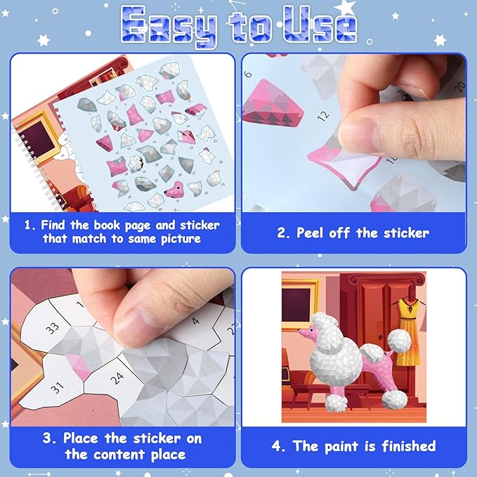 • Easy to Use: Uncover the ideal match of book pages and stickers for every image in our sticker by number books. Easily peel off the cartoon stickers and carefully place them on the designated numbers within the book to unveil a masterpiece of your own making.