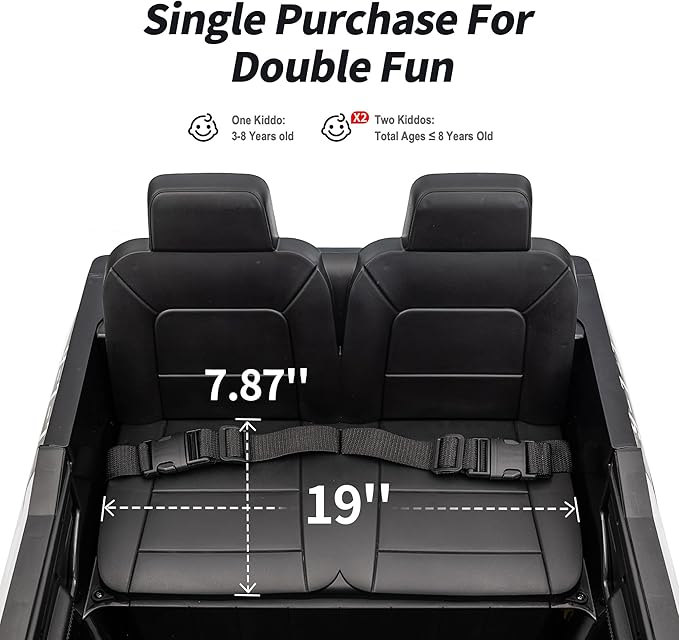 • 19" DUAL SEATER : This battery powered police kids car has ample seater, allowing two children to ride together comfortably under 110lbs. Adjustable seat belts and double-locking door design also ensure kid's safety.