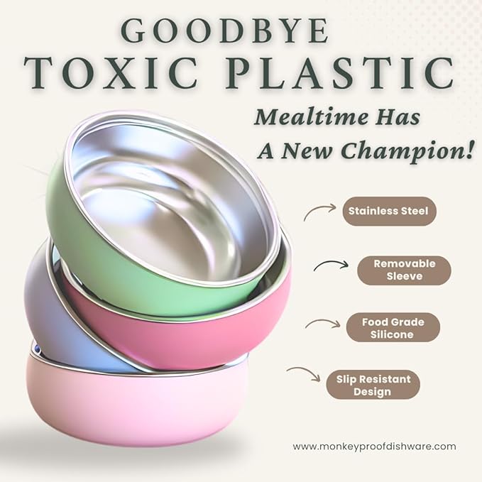 • WORRY AND HASSLE FREE: Monkey Proof stainless and silicone bowls won’t shatter like glass, leach toxic chemicals into your kids food like plastic and bamboo, or fly off the table and clatter like regular stainless steel dishes. These bowls are easy to clean (Dishwasher Safe), stain resistant, and unbreakable!