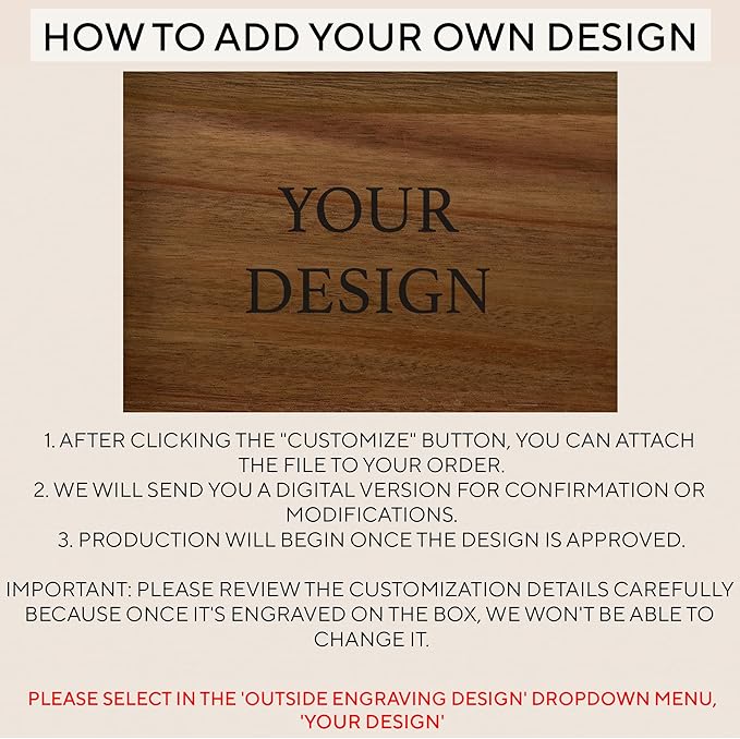 • Your Design Option: If none of our designs match your request, feel free to upload your own in PNG or JPG format. We will send you a digital version for confirmation or modifications. Production will begin once the design is approved.