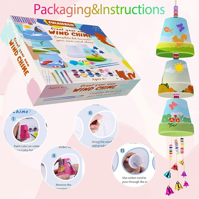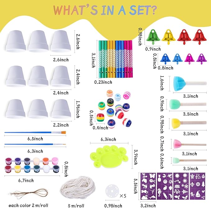 • 【DIY Wind Chime Kits Includes】Our wind chimes for kids includes: 9 big Terra Cotta Pots in 3 sizes, 12 Wind Chime Tubes, 5 Felt pads, 2 rolls cord lines, 12 colors paints, 2 brushes, 45 colored wood beads with holes , 5m cotton cord, 5 sponge stick, 4 stencil,8 color bells ,1 palette,1 instruction manual.Please refer to the product video for detailed operation steps