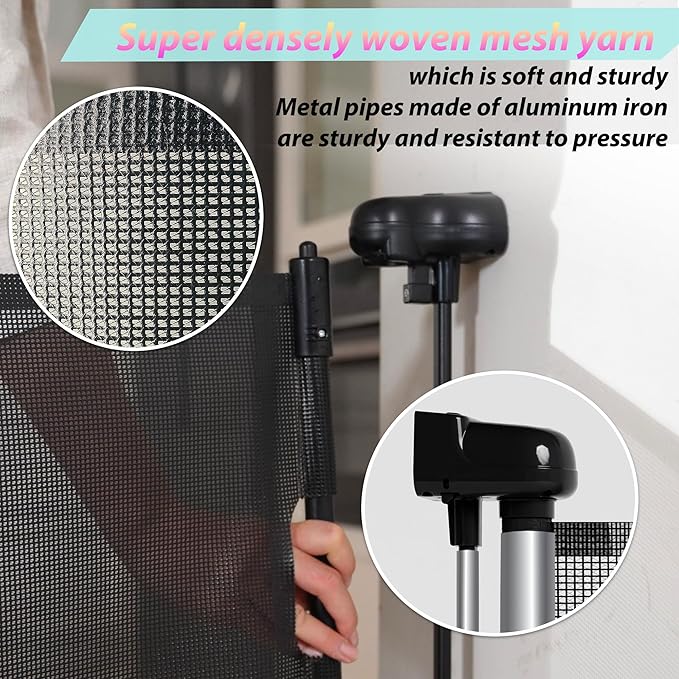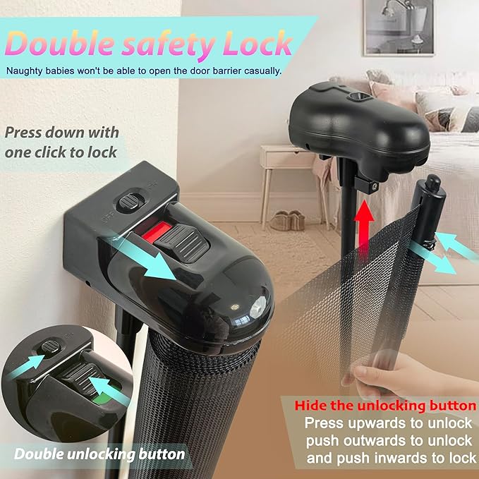 • Safety Double Lock Design - The retractable mesh gate features two locking mechanisms: a mesh lock that controls the mesh's extension and retraction, and a hidden gate lock for opening and closing the gate. Designed for adult convenience, it remains particularly challenging for children, effectively preventing them from opening the gate alone and accessing hazardous areas.