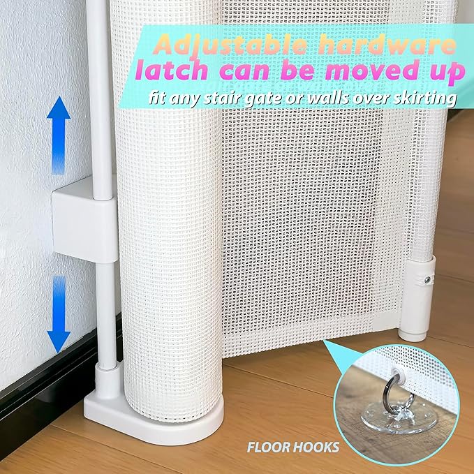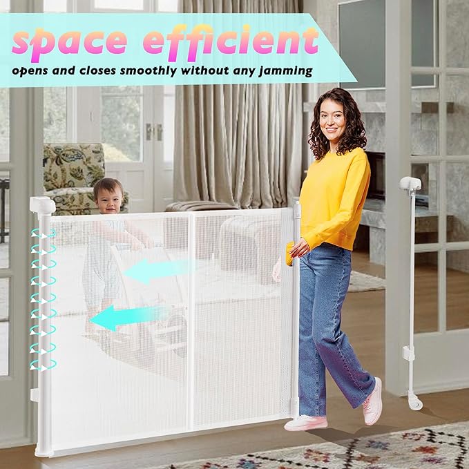 • Safety Double Lock Design - The retractable mesh gate features two locking mechanisms: a mesh lock that controls the mesh's extension and retraction, and a hidden gate lock for opening and closing the gate. Designed for adult convenience, it remains particularly challenging for children, effectively preventing them from opening the gate alone and accessing hazardous areas.