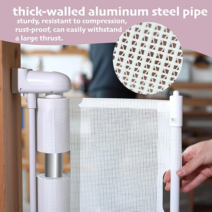 • Safety Double Lock Design - The retractable gate features two locking mechanisms: a mesh lock that controls the mesh's extension and retraction, and a hidden door lock for opening and closing the gate. Designed for adult convenience, it remains particularly challenging for children, effectively preventing them from opening the door alone and accessing hazardous areas.