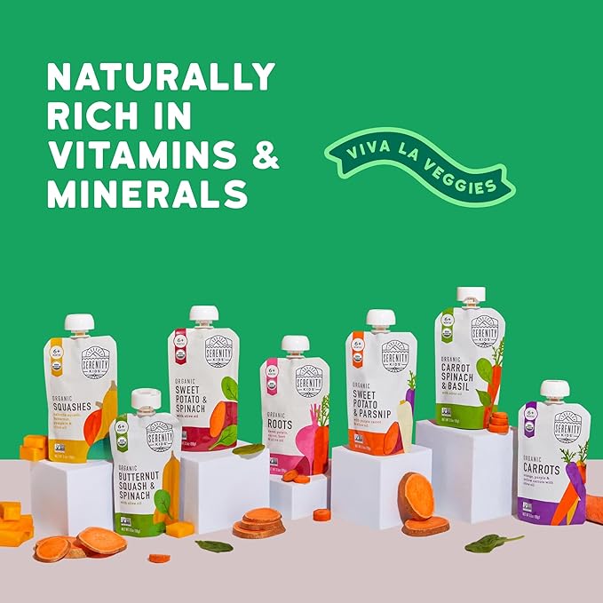 • Savory Veggie Variety: Dive into the goodness of Serenity Kids Organic Veggie Puree Pouches—your partner in fall baby meals for your little foodie in training. Packed with nutrient-dense veggies, these baby puree pouches are perfect for 6+ months and beyond