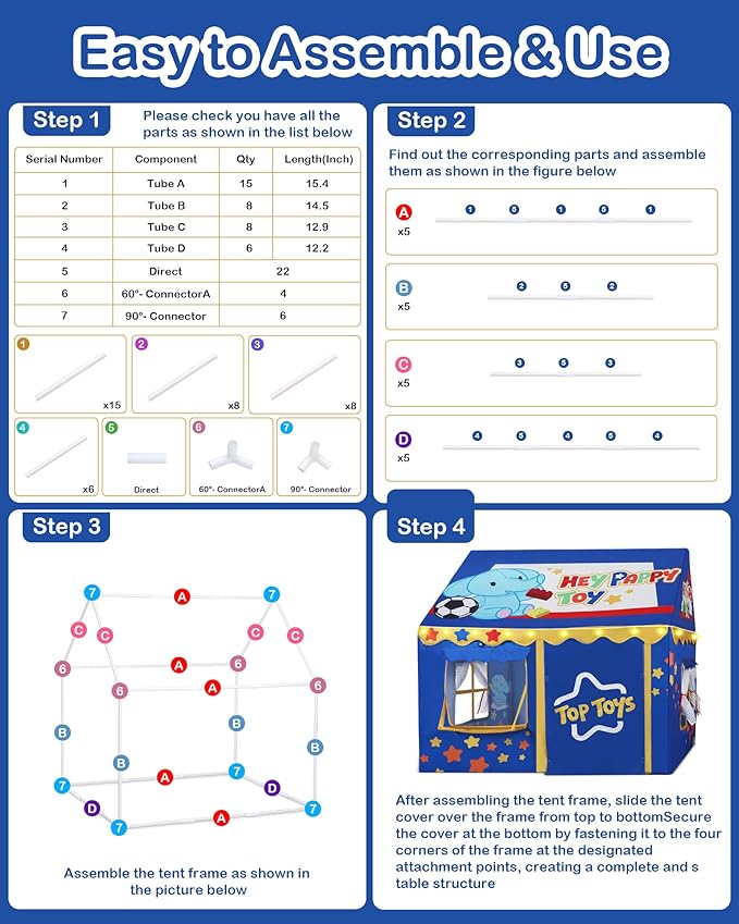 • Easy to Assemble: No tools are required, an adult can assemble the indoor tent in 15 minutes, this toddler playhouse come with a detailed step-by-step instructions. Whether indoors, in the backyard, or at the park, assembly is a breeze—just press firmly to secure the poles and ensure a snug fit for the fabric cover. Come and build a small house with your kids today!
