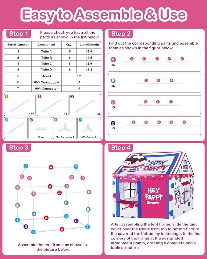 • Easy to Assemble: No tools are required, an adult can assemble the indoor tent in 15 minutes, this toddler playhouse come with a detailed step-by-step instructions. Whether indoors, in the backyard, or at the park, assembly is a breeze—just press firmly to secure the poles and ensure a snug fit for the fabric cover. Come and build a small house with your kids today!