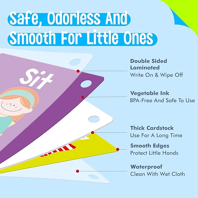 • Well Made: The card adopts sturdy and thickened cardstock with PET film on both sides, durable and tear-resistant. Printed with premium vegetable oil-based ink, BPA-free and safe for kids to use. 2 plastic rings can be used to group, organize, and carry flashcards by category or skill level, keeping everything neat and easily accessible.