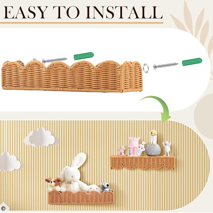 Pinkunn 3 Set Nursery Book Shelves Scalloped Rattan Wall Shelf 15.8 x 3.2 Inch Wall Mounted Plastic Floating Book Shelve, Hanging Boho Wicker Woven Shelf for Nursery Decor and Storage (Natural Wood)
