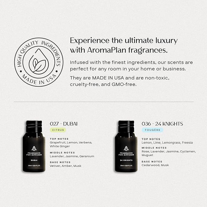 • LUXURIOUS WATERLESS PLUG-IN DIFFUSER WITH 2 FRAGRANCES – The AromaPlan Authentic 2025 Upgraded Plug-In Diffuser uses advanced NT10x nanotechnology to transform liquid fragrance into dry, vaporous microparticles, evenly scenting spaces up to 500 sq ft without water or oily residue. This set includes 2 bestselling 25ml fragrances—Dubai & 24 Knights—delivering fresh, invigorating scents.