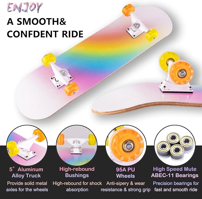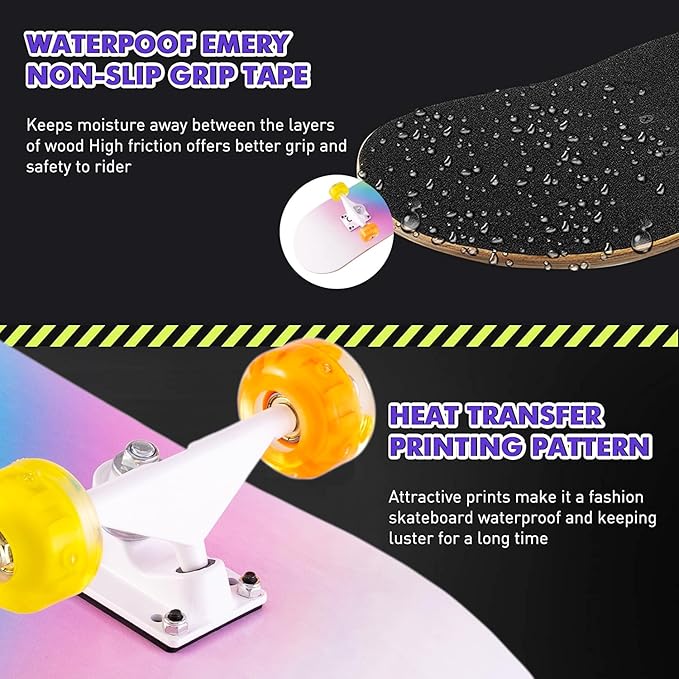 • Patterns Design: Personalized pattern design on the board is quite creative and eye-catching, you will definitely stand out among your friends across the different age range. Also, Skateboards pattern printed with thermal transfer printing process allows greater print durability, lasts much longer.