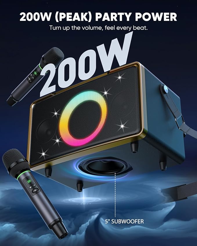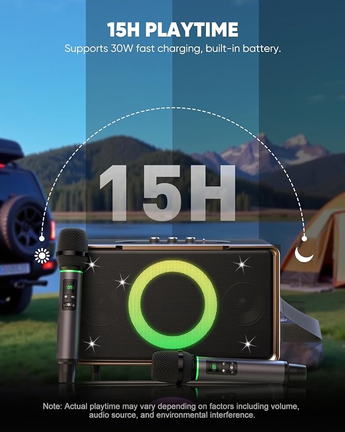 • WIRELESS MIC: Bluetooth speaker with microphone supporting 3 modes (KTV/Reverb/Speech). Bring it to your living room for family party sessions, or take it outdoors for park barbecues and picnics—turn any space into your personal stage.