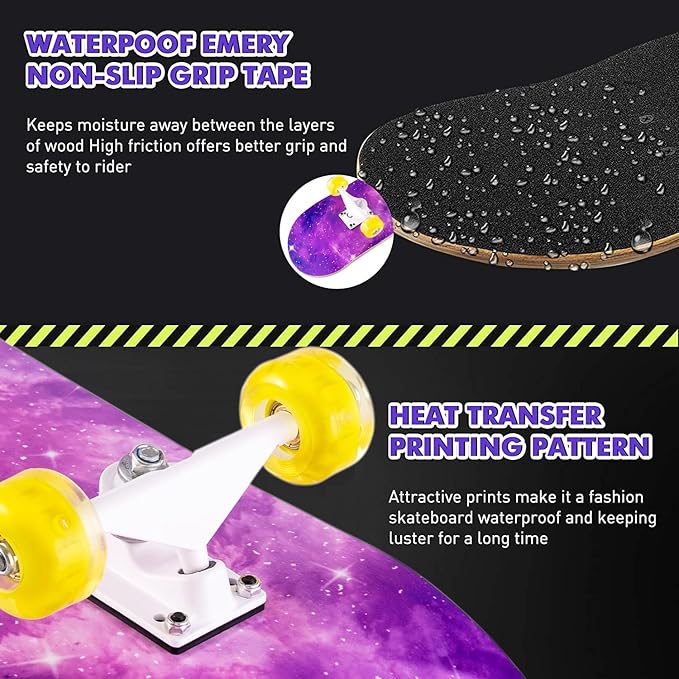 • Patterns Design: Personalized pattern design on the board is quite creative and eye-catching, you will definitely stand out among your friends across the different age range. Also, Skateboards pattern printed with thermal transfer printing process allows greater print durability, lasts much longer.