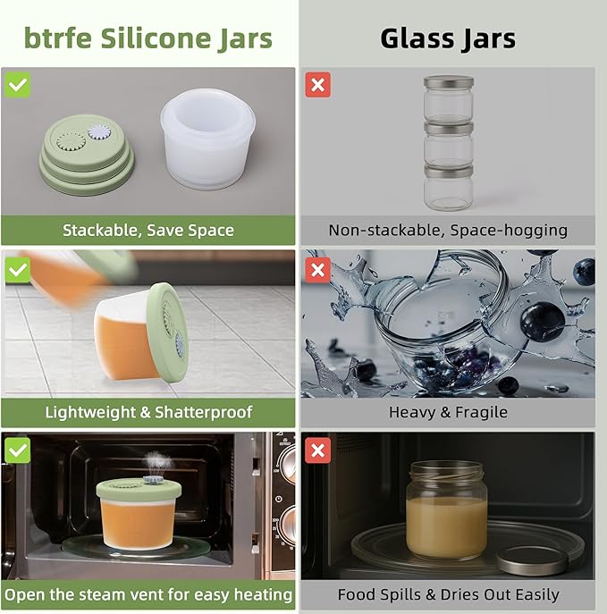 • 💌 Effortless Cleaning & Lifetime Durability: Dishwasher-safe for hassle-free cleanup. Unlike brittle glass or warping plastic, our silicone jars resist stains, odors, and deformation. Reusable for years—save money and the planet!