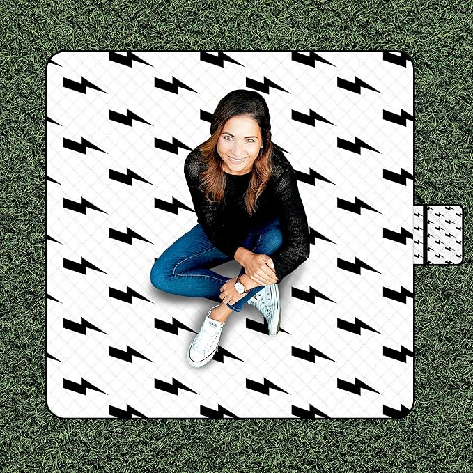 • Eye-Catching Lightning Pattern: Featuring a bold black lightning bolt design on a clean white background, this picnic blanket adds a stylish and modern flair to your outdoor setup—turning heads while offering function and fun.