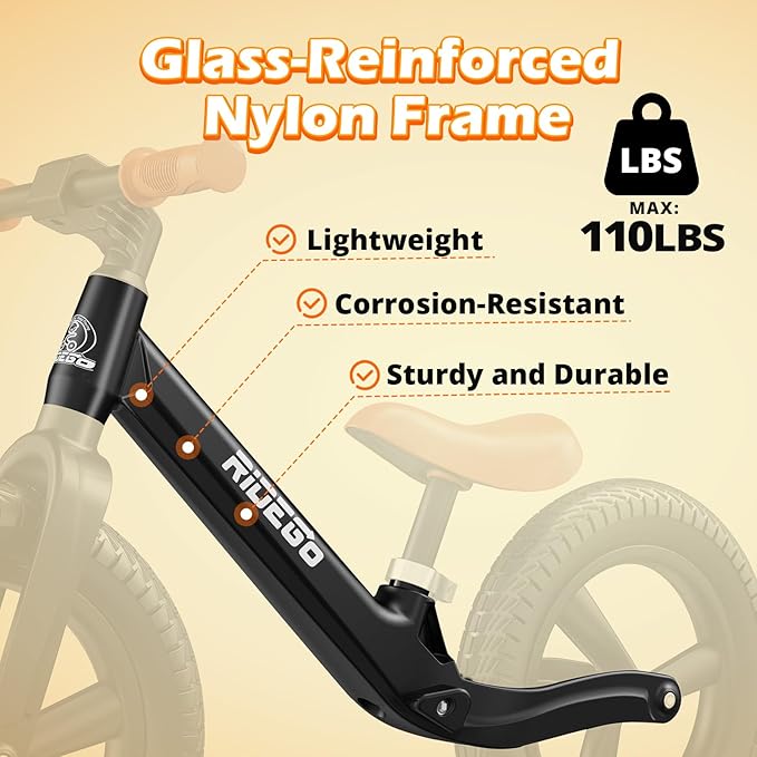 • 【LIGHTWEIGHT & DURABLE FRAME 】Built with a glass-reinforced nylon frame, this balance bike offers the same strength as carbon steel with a weight capacity of up to 110 lbs, while weighing only 8.16 lbs. It is also more corrosion-resistant and lightweight. Designed for long-lasting performance, it's easy for kids to handle and parents to carry.