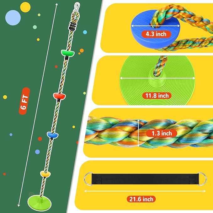 Tree Swing Rainbow Climbing Rope, Heavy Duty Swing Disc Seat Replacement for Kids with Hanging Strap and Platform Carabiners Indoor/Outdoor Playground Accessories (Leaf Green)