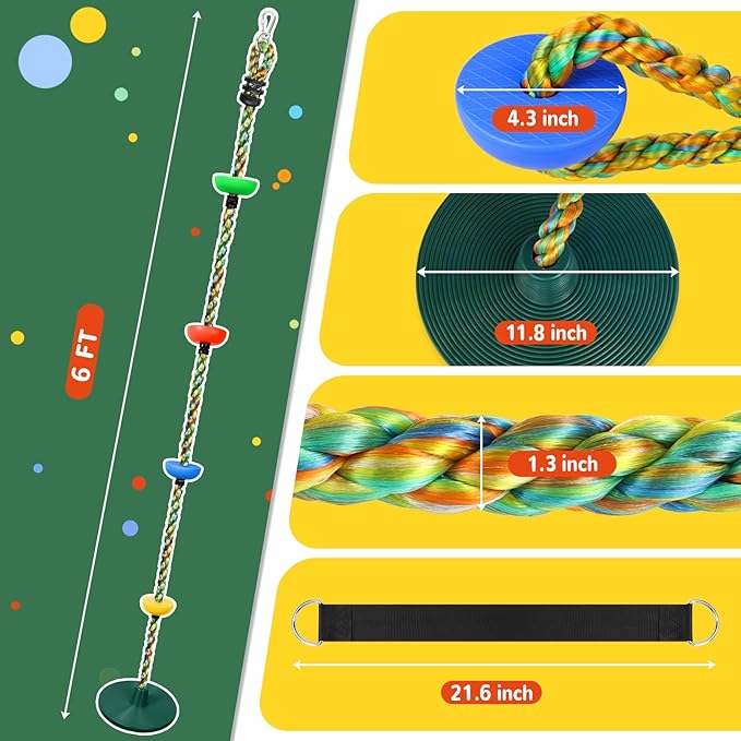 • 【UNLEASH MORE PLAY POSSIBILITIES】- Transform your tree swing into a multi-play adventure! This tree swing is a happy land where kids can swing, climb or stand, leveling up challenge and fun than regular swing. Adjustable rope length lets you customize height for each child—perfect for growing families with toddlers to teens.