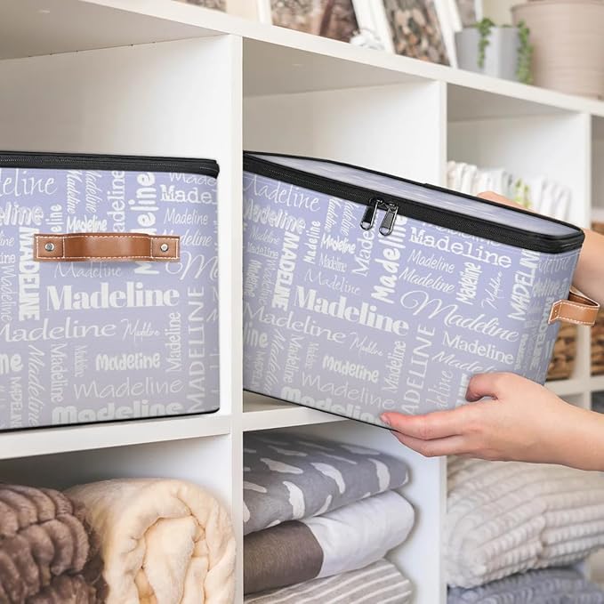 Custom Storage Basket with Name, Personalized Storage Bins with Zipper Lid, Foldable Fabric Storage Box Large capacity with Handle Purple White