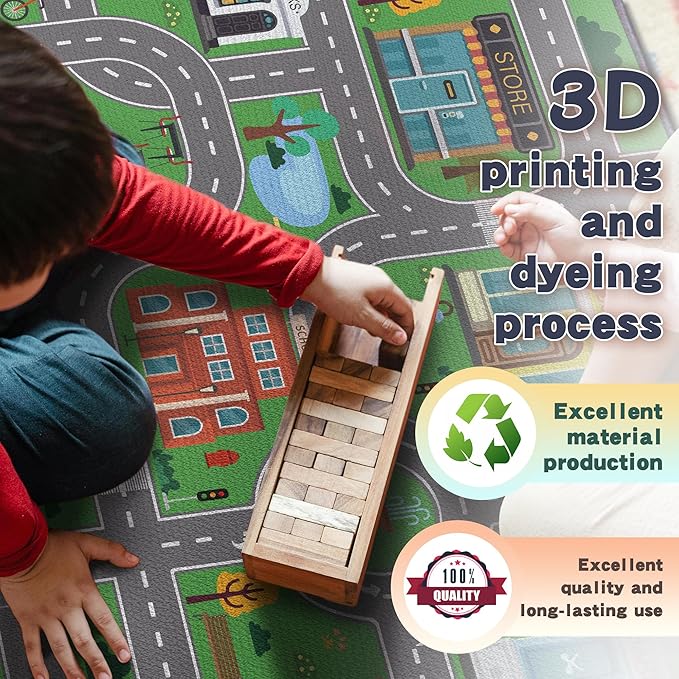 • Detailed & Recognizable Scenes:Our carpet includes facilities such as a bakery, bookstore, department store, pharmacy, supermarket, hair salon, and school, allowing children to enjoy having a city of their own that they can control.