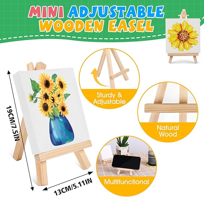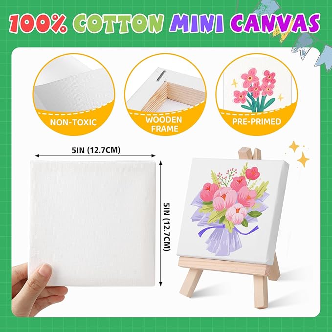 • 【 Mini stretched canvas and easel】: The 24 set mini acrylic paint set provide 5 x 5 inch small canvas with 7.5 inch mini wooden display easel. Kids can show their creations anywhere. Our mini canvas are safe and non-toxic, making them perfect for kids to use. These small easels are sturdy,can be used to hold photos, phones and more.