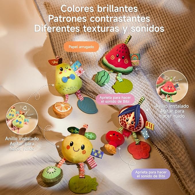 • MULTIi-SENSORY FRUIT RATTLE SET: Cheerful pear, watermelon, peach and pomegranate plush designs captivate babies with vibrant colors and textures. Stimulates sight, touch, and hearing—shaking triggers jingling bells/beads, crinkly paper rustles, and a soft "bi-bi" squeaker. Lightweight, safety-tested, and ideal for cribs, strollers, or playtime. Encourages sensory exploration through interactive sound play!