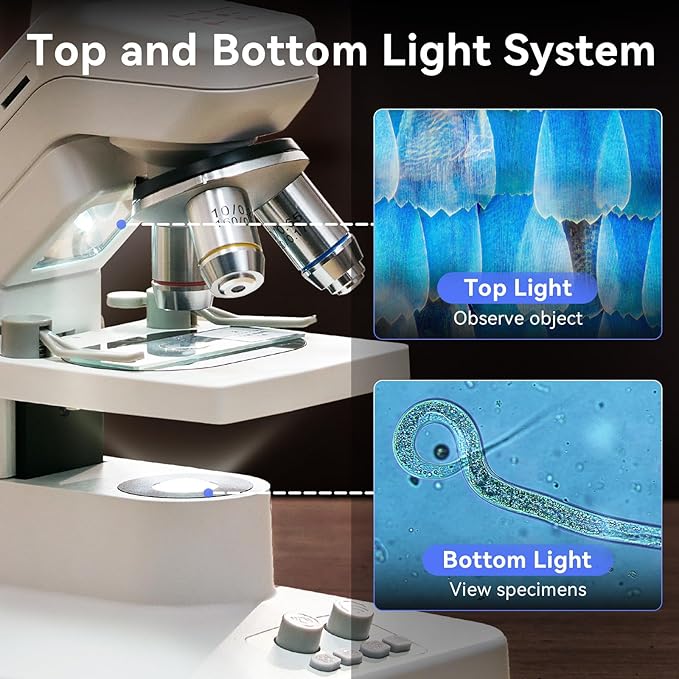 • Dual LED Lighting System: Balanced top and bottom LED lighting with adjustable brightness ensures the clarity needed for slide or specimen viewing—lighting that rivals any dedicated water microscope used in lab settings