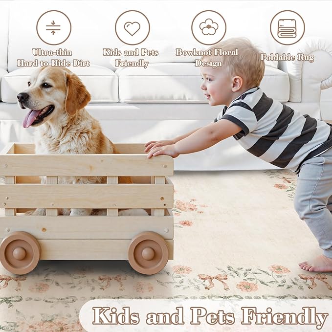 Wonnitar Floral Bow Washable Area Rug 5x7, Ultra-Thin Beige Rugs for Bedroom, Boho Non Shedding Neutral Soft Carpet for Nursey Kids Room Dorm Living Room, Beige