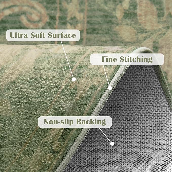 jinchan Round Rug 4ft Area Rugs Vintage Floral Distressed Design,Machine Washable Soft Non-Slip Low-Pile Ultra-Thin Circle Rug for Entryway Bedside Living Room Kitchen Nursery (4' Round,Dark Green)