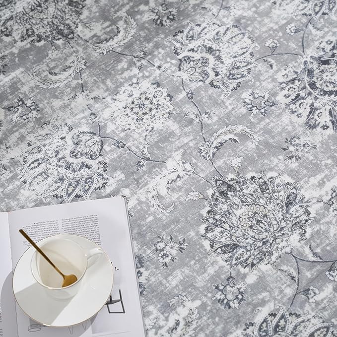 jinchan Round Rug 8ft Area Rug - Grey Vintage Floor Mat Kitchen Indoor Ultra-Thin Soft Floral Print - Washable Circle 8' Retro Accent for Farmhouse Non Slip Dining Room Living Room Bedroom Office