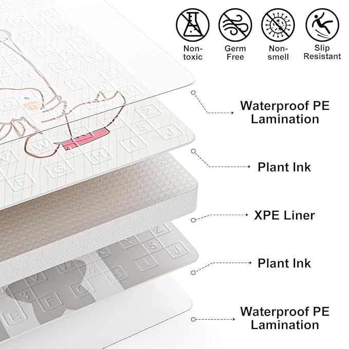 • Safe and Comfortable: Made of high-density, scratch resistant XPE foam material, BPA free and non-toxic, provides ample space for babies to crawl, walk and play. 0.4 inch thick mat provides cushioning protection, protect infants from serious falls and floor collisions