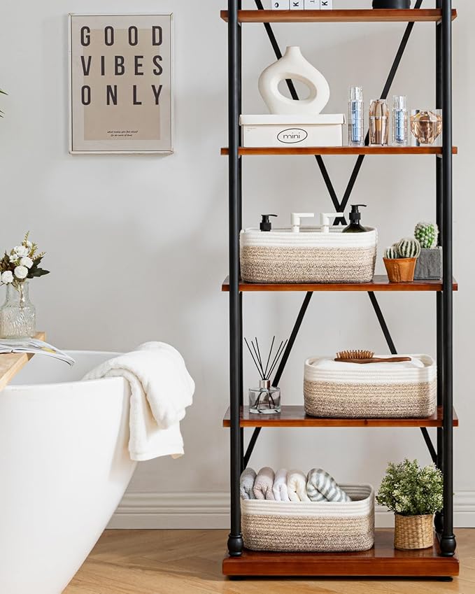 • [ Elegantly Designed to Match Any Décor ] Our small rope basket creates a minimalist appearance, and it adds a touch of warmth and texture to any room. The classic solid color design ensures seamless integration with your existing aesthetics, complementing any decoration. Perfect as decorative storage baskets for shelves, cabinets, and any open display space, making them a stylish and practical addition to any decor, enhancing the overall aesthetics of your room