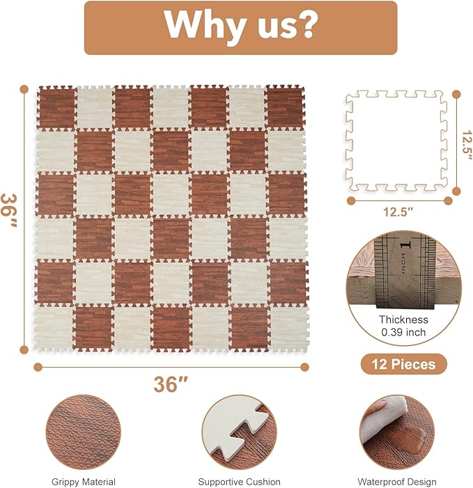 • Cold-proof: Each 0.4" thick cushioned tiles acts as a barrier between your feet and cold, hard floors. The textured surface, combined with the mat’s thickness, offers a cozy, flannel-like feel that adds an extra layer of warmth, making every step feel like a sunny day.