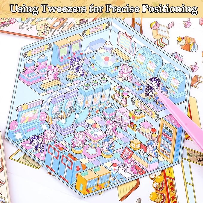 • Various Scenes: The sticker set includes 4 sticker sets, 4 background boards, and a tweezer. Scenes feature a Kapi Gym, Puppy Bun Shop, Bear Classroom, Pony Arcade. Mix and match for endless DIY 3D house creations!