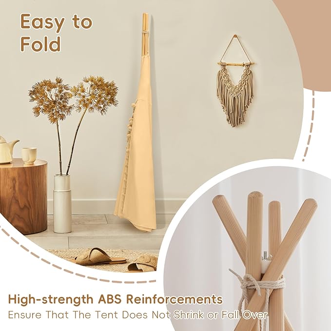 • CHILD SAFE: The teepee kids tent comes with natural wood poles to withstand the curious play of children. All seams, unfinished fabric edges and openings are reinforced to ensure safety, durability and years of safe play for your child. Wood poles are sanded to prevent splinters. Comes with a flap door and mesh window for ventilation.