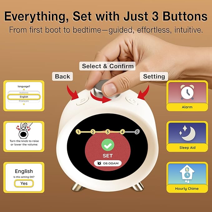 • 【Sleep Sounds & Animated Retro Game & Kids Themes】– Fall asleep peacefully with 10 calming Sleep Sounds, including White Noise, nature ambiances, and gentle melodies. Brighten your routine with screen auto-dimming to night-friendly brightness, while real-time temperature/humidity readings help optimize your sleep environment.