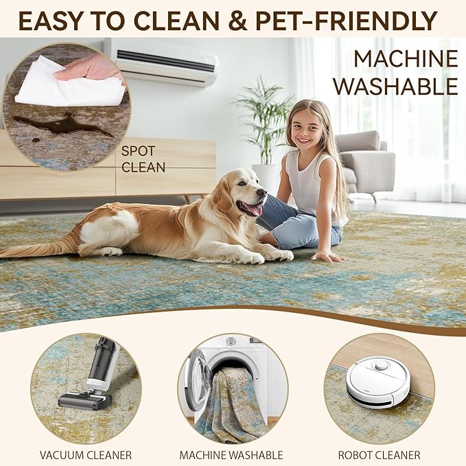 • Tides Series – Effortless style that flows with your life.This modern machine-washable non-slip rug features reinforced edges and a low-pile design that resists dirt. Its water-repellent surface makes spills easy to clean - liquids bead up for quick wiping. Simply machine wash in cold water (no bleach) to refresh. The non-slip backing keeps it securely in place. A perfect blend of function and contemporary design for active homes.