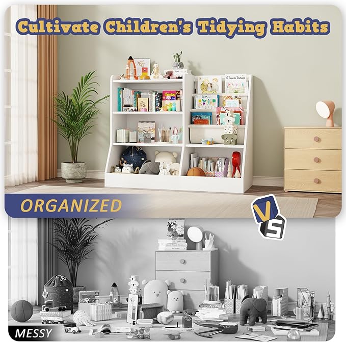 • Larger Size & Stable Structure --- Dimensions: 39.3"W x 15.7"D x 31.5"H, this bookshelf for kids is larger in size, providing more storage space for more book supplies and toys for kids of all ages.This bookhelf with storage has precise hole matching, complete required accessories and comes with installation instructions, which makes the installation easier, easier to assemble and more stable structure.