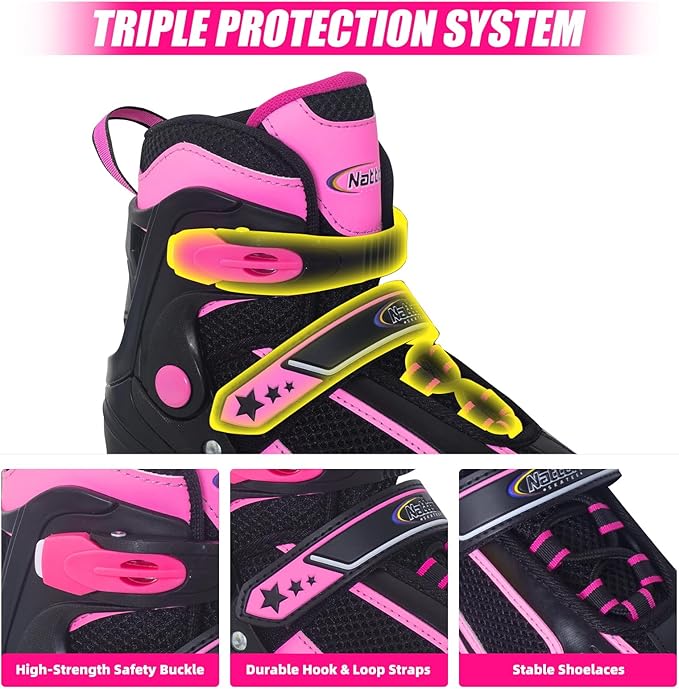 • SIZE ADJUSTABLE: With the ease of size adjustment at the touch of a button, it's easy for kids to put on/take off. These skates can grow with your child because the shoes can be adjusted to four sizes. Nattork inline skates are available in three sizes: S(10C-13C)/M(1-4)/L(5-8), please check our size chart for the specific length of the shoes