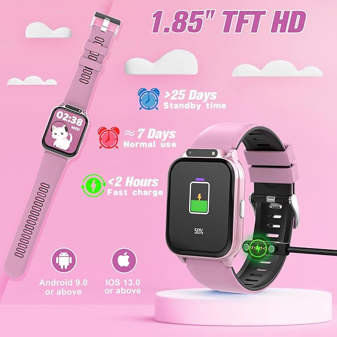 Smart Watch for Kids 1.85" with Fitness Tracker, Sleep Monitor, 22/100+ Sport Modes, DIY Dial, IP68 Waterproof, Step Counter, Heart Rate, Camera, with/Without APP, Gift for 3-12 Years Old Girls