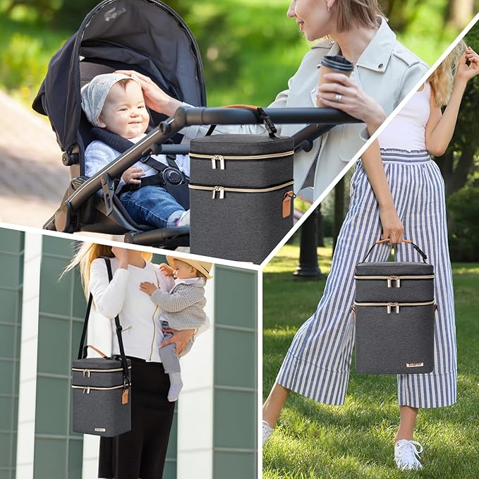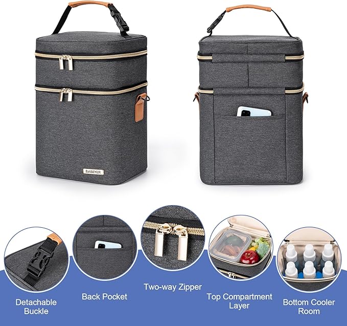 • Convenient Two-Layer Design: With its two-layer design, our breastmilk cooler bag offers maximum versatility. The upper layer is perfect for storing lunch boxes and food, while the lower layer can accommodate up to 6 bottles. Stay organized and keep everything in one place.
