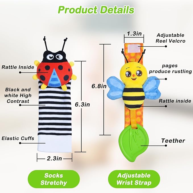 • Rattle Socks Wristband Set-This baby sensory toy set includes two soft wrist rattles,two cute foot finders and two soothing teething toys,the adorable garden bug designs are crafted to attract your baby's attention,encouraging them to touch,grab,and explore,extremely companions for your baby's growth.