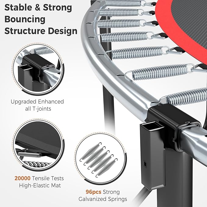 • 【Premium Bouncing Experience】This Tatub large trampoline is supported by 96 robust springs, guaranteeing stability with every bounce. Its heavy-gauge galvanized steel frame forms 6 W-shaped legs with bars, providing a solid foundation for the jumping zone