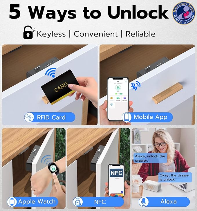 • 🔒【5 Ways to Unlock】: The smart cabinet lock can be unlocked through the Mobile App, Apple Watch, RFID Card, NFC, and Alexa. It makes unlocking more convenient and fast, without worrying about forgetting the passcode or losing keys.