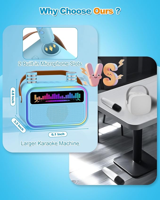 • Built-in Microphone Slots: No more lost mics! This protable karaoke machine comes with 2 handy built-in kid microphone slots,so your child’s mics stay securely stored when not in use,perfect for travel, playdates, or family trips! Say goodbye to missing microphones and tangled wires