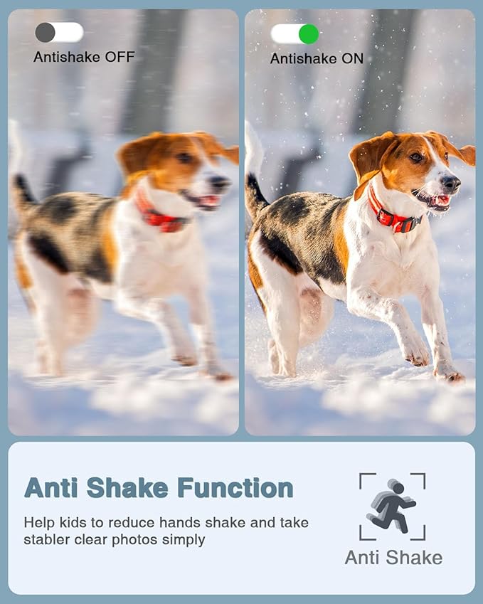 • MEANINGFUL GIFT - This black digital camera for kids is equipped with a high-level CMOS Sensor and anti-shake function, which helps to capture vivid clear 44MP Images and record stable smooth FHD 1080P resolution videos. It's a meaningful Christmas or birthday gift camera for kids to cultivate their interest in photography, experience the lovely life, and leave funny memorable moments with family or friends.