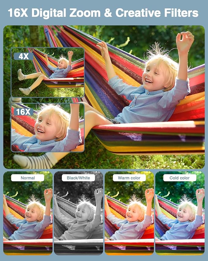 • SAFE MATERIALS & CREATIVE FILTERS - Made of high-grade and eco-friendly reliable materials, the kid camera is safe and non-toxic, durable and withstands drops. This digital vlogging camera for teens also supports six cute filter effects to choose from, kids could create more adorable colorful pictures.